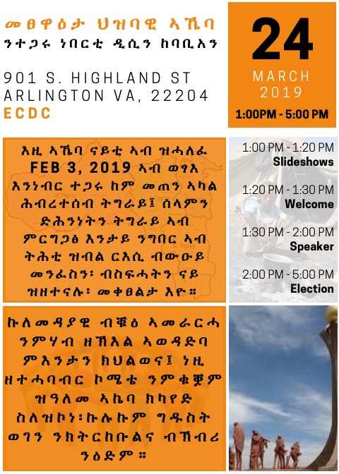 This is to update you that the upcoming Tigrai Grand Conference has been decided to be from July 28-August 1 (5 Days) in Mekelle. The starting date was previously advertised as July 29, but now it will start on July 28 (one day earlier). Hence, please mark the date in your calendar as JULY 28- AUGUST 1, 2019 in Mekelle, Tigrai.
