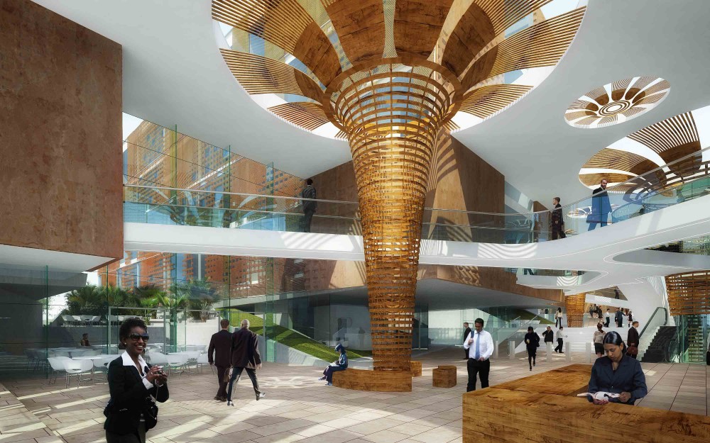 In cooperation with BET architects from Ethiopia, Söhne & Partner shared with us their winning proposal in the international design competition for Ethiopian Airlines New Headquarters in Addis Ababa. Their design is intended to address the need of the airline’s growth, dynamic operation and attaining its Vision-2025. The landscape, being an important part of the interior design, is flowing through and underneath the building. The office blocks are cantilevered above the street level as a floating form to represent the mountains, canyons or rocks. More images and architects’ description after the break.